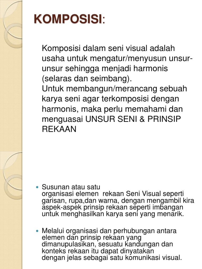 Sejarah Dan Apresiasi Seni Visual from image.slidesharecdn.com Asas seni reka asas seni reka merangkumi aspek elemen dan prinsip rekaan dalam seni tampak. Tanpa agen ini tiada produk seni. Warna ialah unsur visual yang memainkan peranan penting dalam penghasilan karya dan kehidupan seharian. Ini adalah disebabkan oleh rangsangan daripada jenis mud muzik tersebut. Terdapat tiga kaedah penilaian dalam seni visual secara khususnya,iaitu pemerhatian, lisan dan interaksi, dan penulisan. Sorotan kajian 73 pengenalan 73 pembangunan peralatan teknologi seni digital 74 teori pembelajaran seni visual berasaskan komputer 75. Video ini adalah sebagai pemahaman konsep dan tema/fokus setiap aliran mengikut zaman. Ini juga dapat dianggap sebagai organisasi dari unsur seni menurut prinsip seni rupa.